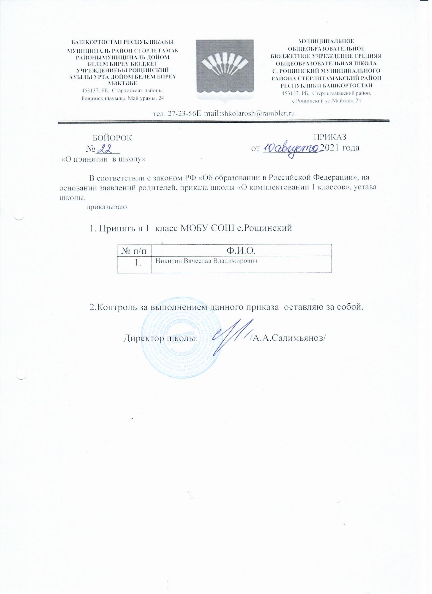 Приказ о зачислении в 1 класс на 2021-2022 учебный год (№22 от 10.08.2021)
