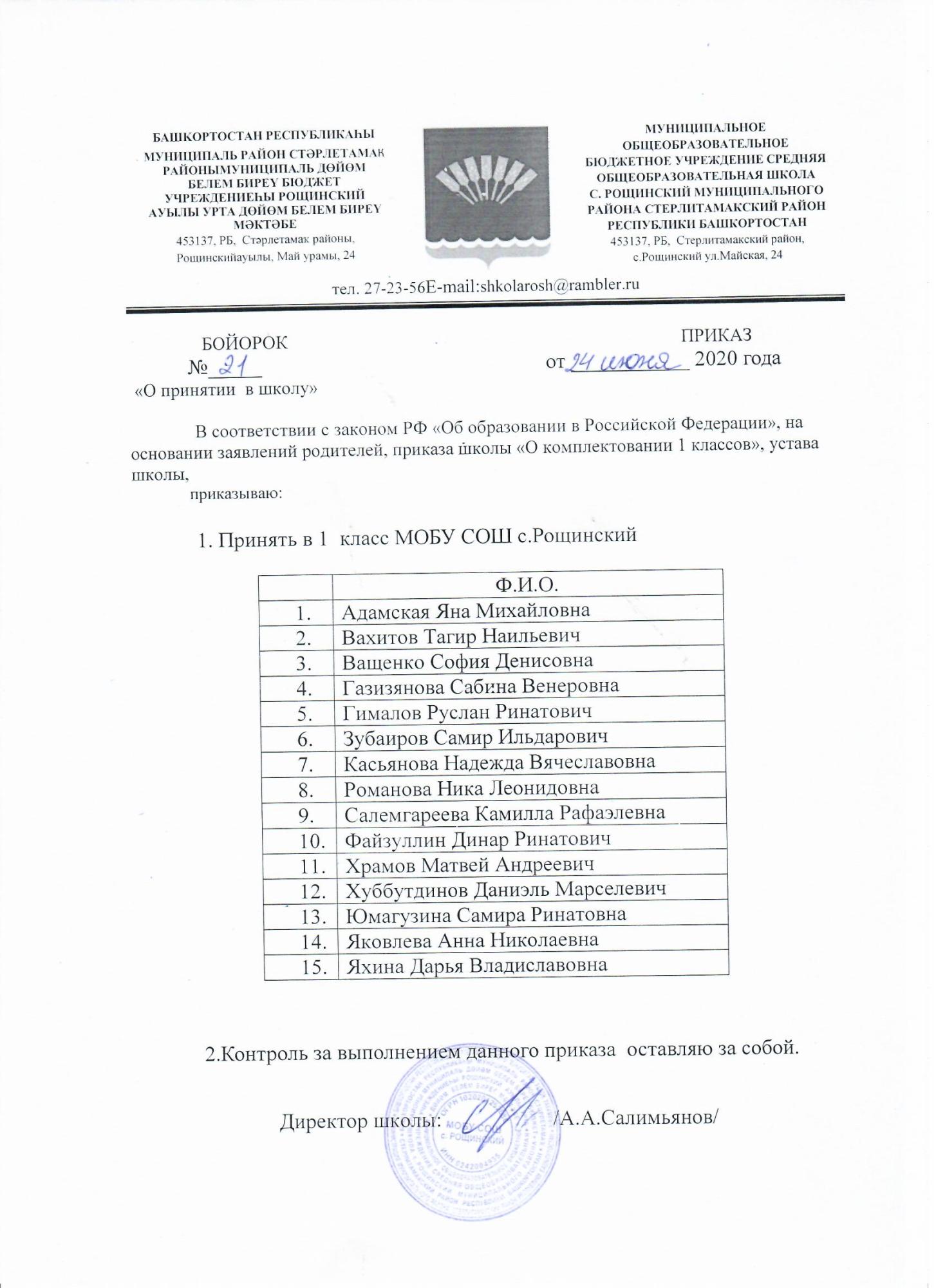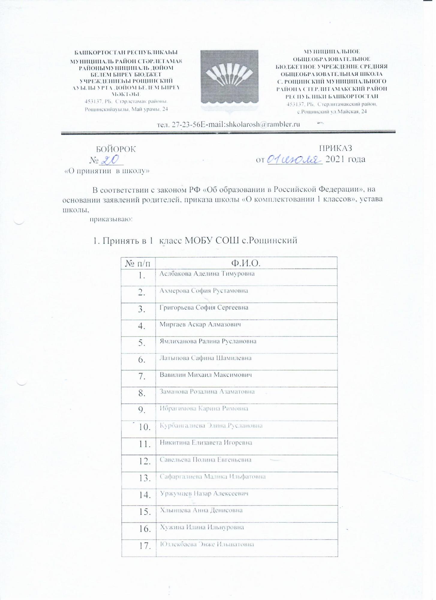Приказ о зачислении в 1 класс на 2021-2022 учебный год (№20 от 01.07.2021)