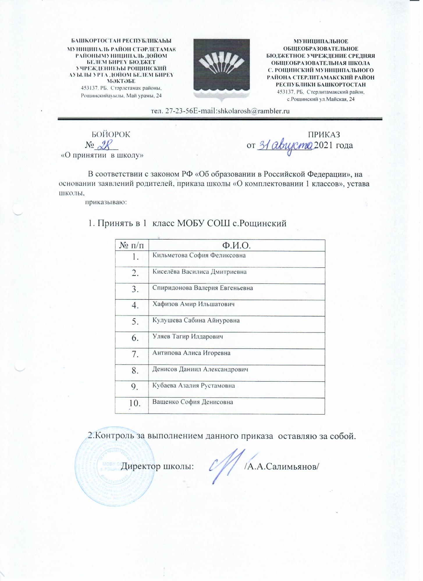 Приказ о зачислении в 1 класс на 2021-2022 учебный год (№28 от 31.08.2021)